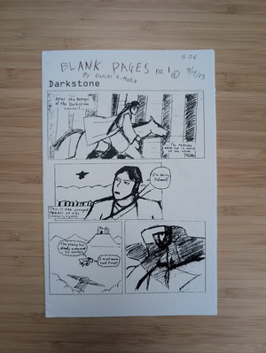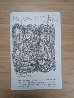 I was homeschooled from third through eighth grade. Among the many things that changed when I started high school in the fall of 2002, two of them were regular access to a coin-operated copy machine in the school library and small bits of cash to pay for bus fare. Inspired by "Zine Scene" and an upper classman who was pursuing comics somewhat seriously, I made this small collection of 1-2 page comics during my second semester of high school. I called the collection "Blank Pages no. 1" because I stapled together single sided copies resulting in blank backsides between pages of content. I was scared to show my work and ask someone how to make double sided copies and too cheap to experiment with the library copy machine to get double sided copies to work.