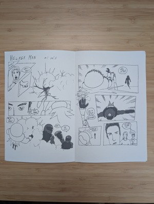 Just before the end of my first year of high school, I completed the second (of two) issues of my comics anthology, "Blank Pages." I wanted to give copies of them to my friends who were seniors before they graduated. This second issue features a quickly drawn cover with a request for connection (via email). This is something that feels like an ongoing theme of my work and life. It also features a "grown up" version of a hero I created as a child which I called "Helper Man." Helper Man wore an Iron Man-like suit of armor which featured a Mega Man-like arm mounted "non-violent" vaccum and was orginally drawn a bit like Bomber Man.